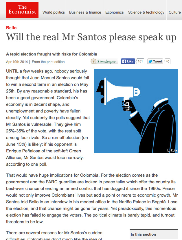 Will The real Mr Santos Speak Up / Colombia's tepid election. Illustration for The Economist, Latin American column: Bello