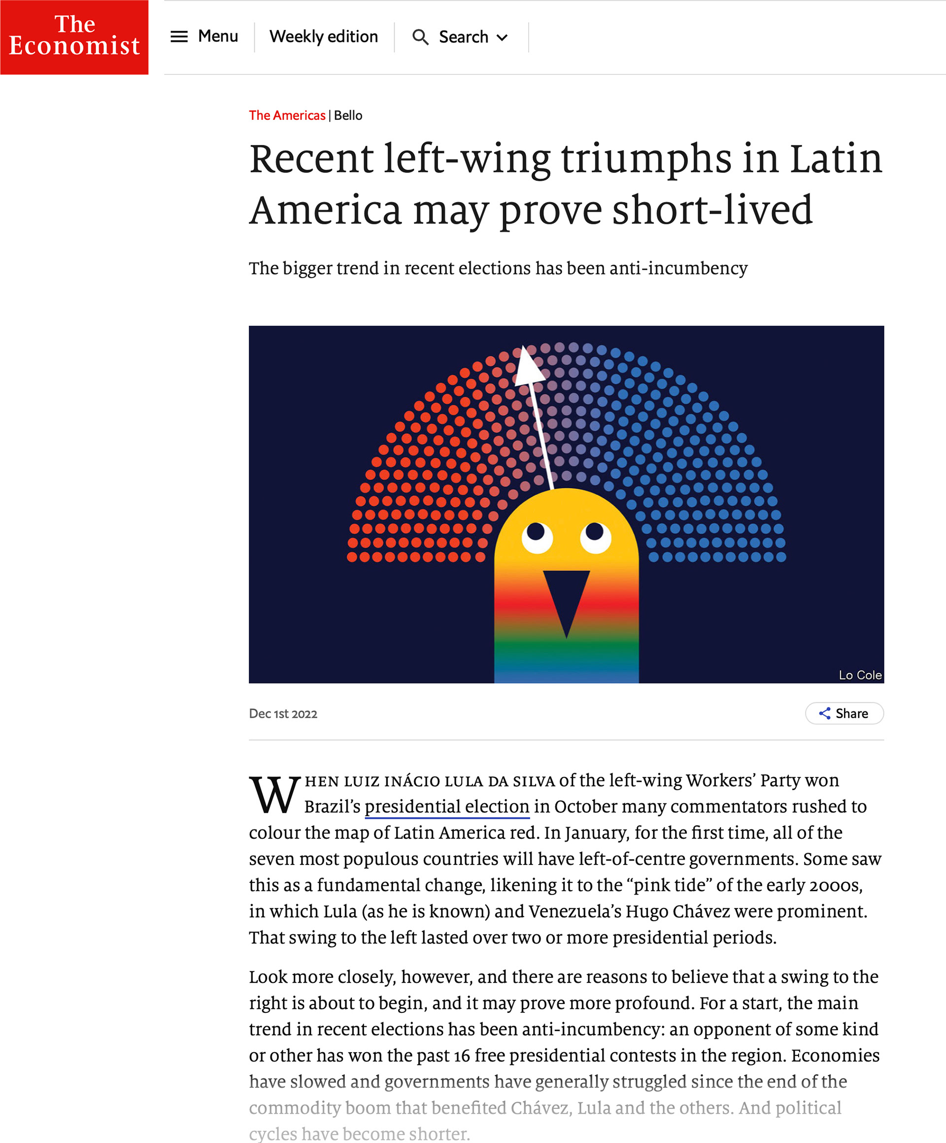 Recent left wing trumps in Latin America may be short-lived - Illustration for The Economist - Bello column