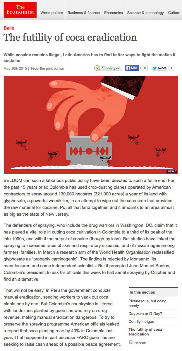 Illustration for The Economist, Bello column - The futility of coca eradication.